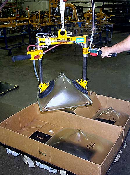 VM和VB系列真空吸吊機(jī)是高度集成的單人操作真空搬運(yùn)輔助系統(tǒng), 適用于透氣、半透氣和不透氣物體。 依靠真空吸盤來(lái)吸附物體, 通過(guò)電動(dòng)或氣動(dòng)葫蘆來(lái)提升物體。 系統(tǒng)操作簡(jiǎn)單, 安全可靠。VH系列真空吸吊機(jī)具有以下特點(diǎn): 故障率低, 維護(hù)簡(jiǎn)單 集成設(shè)計(jì), 最大提升高度2.8米, 最大提升重量500公斤 操作簡(jiǎn)單, 通過(guò)控制面板來(lái)上升、下降和釋放 持續(xù)吸附, 真空泵持續(xù)工作, 物體可長(zhǎng)時(shí)間被吸附。 頂部空間小, 僅需要73厘米頂部空間 可選用雙速或無(wú)極變速電動(dòng)葫蘆 多功能, 根據(jù)不同物體可更換不同吸盤 應(yīng)用廣泛, 不管什么物體, 透氣、半透氣、不透氣物體都可應(yīng)用